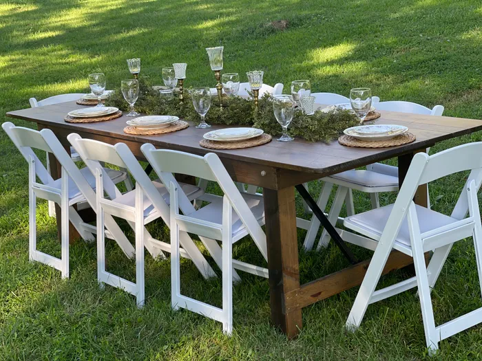 Rustic dining table with padded chairs sets the atmosphere for any celebration.